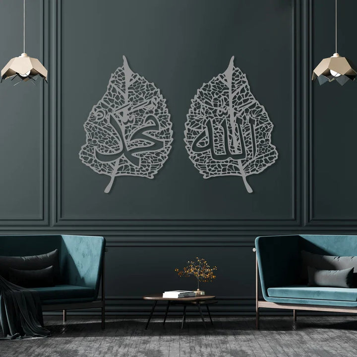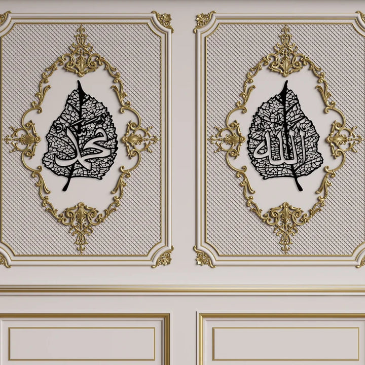 Allah (SWT) Mohammad (PBUH) Islamic Wooden Wall Art Leaf Design Islamic Decor Islamic Art Set of 2