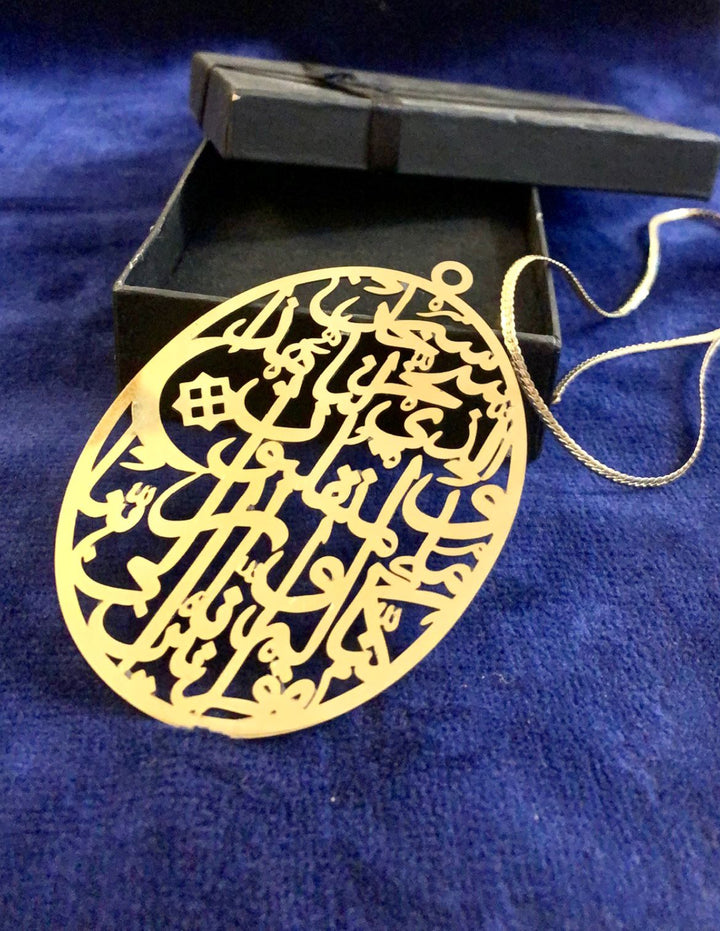 Gold Plated coated Pendant laser cutting beautiful gift pack Islamic calligraphy product high-quality laser cutting in Karaci Pakistan Laser cutting Gift pack for family and friends. creative Gift of Gold Plated Pendant laser cutting, Creative Islamic Calligraphy with state of the art Laser Cutting in KARACHI PAKISTAN SIZE: 3 TO 3.5 INCH APPROXIMATELY THICKNESS: 0.8 MM