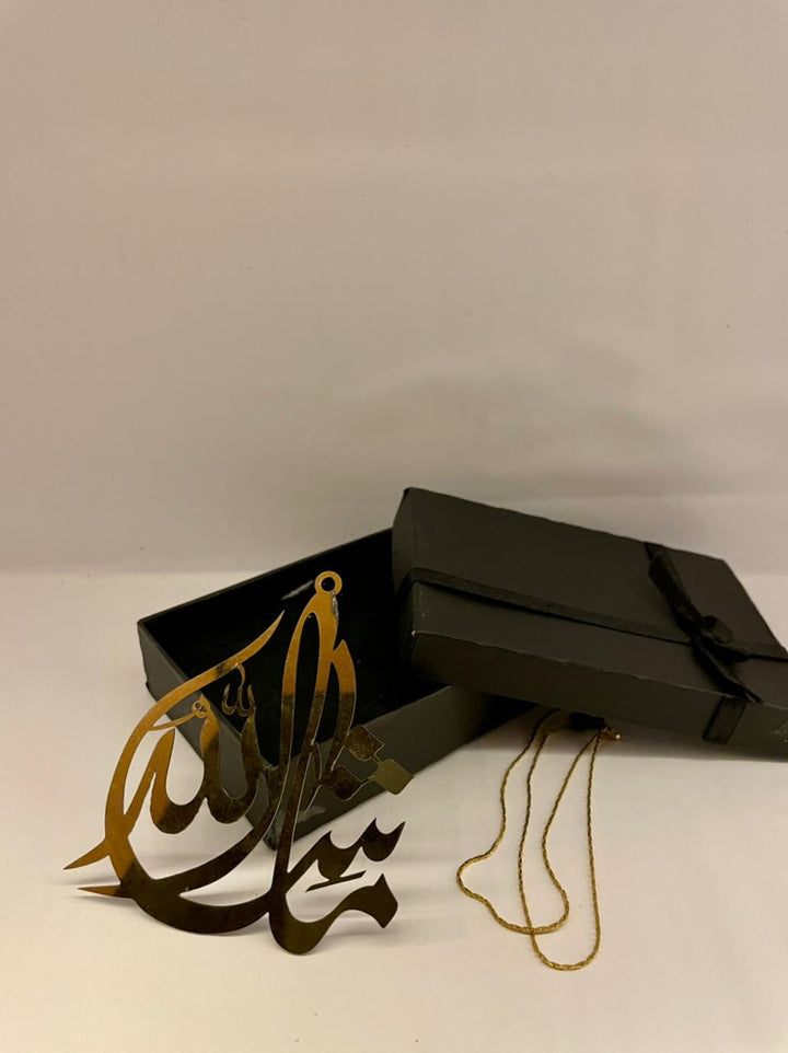 Gold Plated coated Pendant laser cutting beautiful gift pack Islamic calligraphy product high-quality laser cutting in Karaci Pakistan Laser cutting Gift pack for family and friends. creative Gift of Gold Plated Pendant laser cutting, Creative Islamic Calligraphy with state of the art Laser Cutting in KARACHI PAKISTAN SIZE: 3 TO 3.5 INCH APPROXIMATELY THICKNESS: 0.8 MM