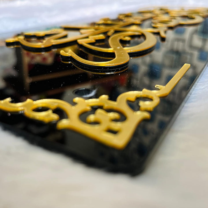 Its made from 3 layers of acrylic. The bottom layer is Black 3mm Acrylic and the top layer is 1.2mm Silver/Gold Acrylic to give it metallic finish look at a very affordable cost. These 2 Layers are then fixed to a mirror finish Black Acrylic of thickness 5mm